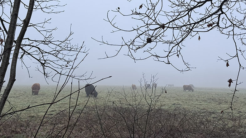 Bij de Takkenhoogte heb je een kleine verhoging met uitzicht over de vennen. Vanmorgen was dat door de mist helaas niet heel goed zichtbaar, maar je merkt aan alles dat het hier normaal gesproken weids is. Daarna kom je door het gebied waar ook Schotse Hooglanders lopen. We zagen veel verse sporen. Gelukkig heb ik de Hooglanders alleen achter een hekje gezien, want ik ben er gewoon niet zo’n fan van.