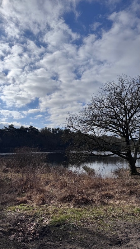 Via het bos lopen we het afgesloten gebied weer uit en komen we op een breed zandpad welke richting het oefenterrein loopt. We lopen langs vennetjes en kijken een eind weg over de heide.